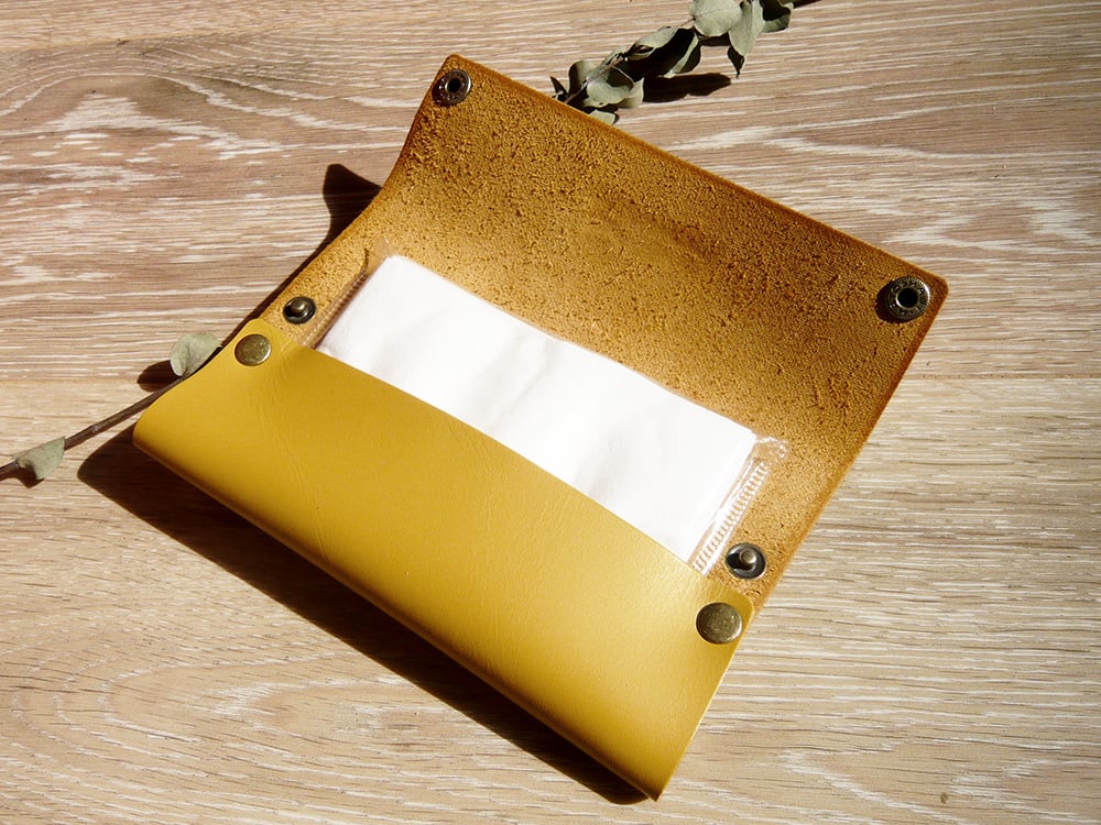 ◆マスタードイエローのエレガントなポケットティッシュケースは、定番人気タイプ。 柔らかく、しっとりとした質感のスムースレザーは極上の手触りで高品質の証。